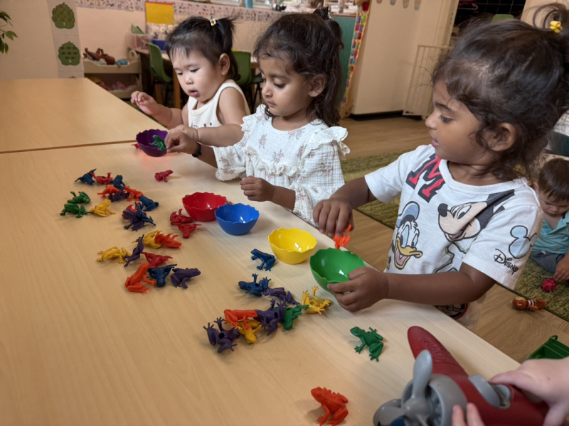 Ellie, Imaan and Sara sorting out frogs by colour!