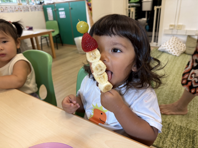 Lulu enjoying his snowman fruit kebab!