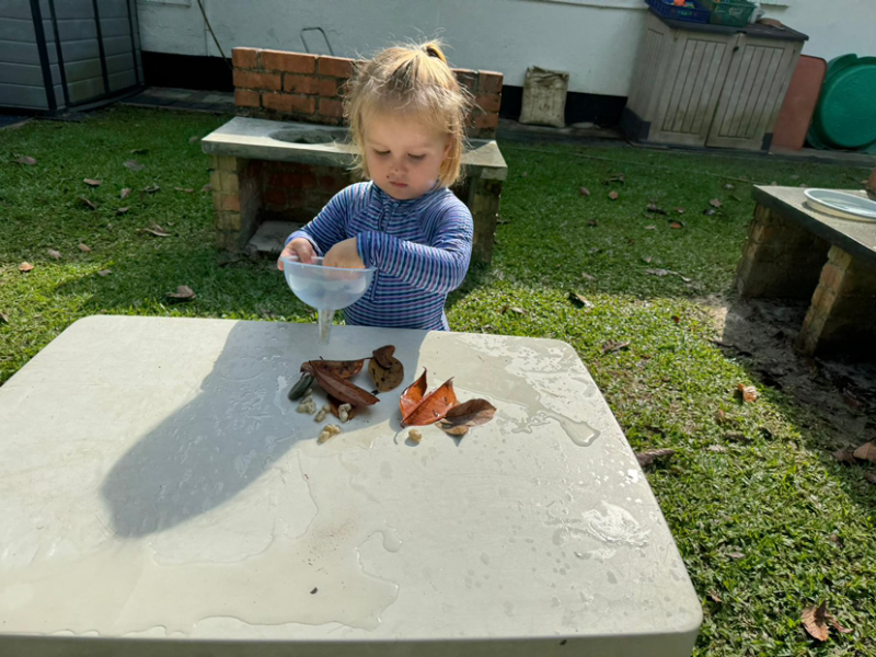 Charlotte watering her collection of leaves!