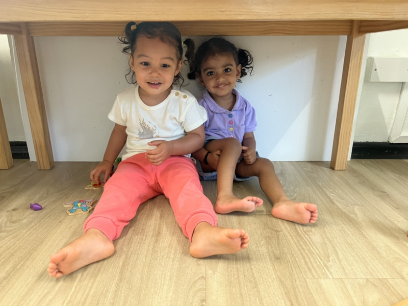 Hi girls! What are you doing under the table!?