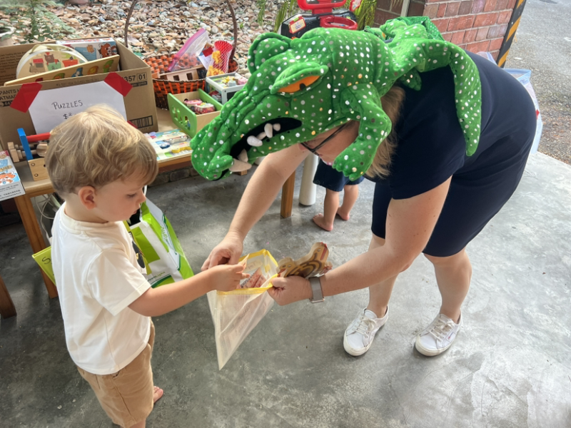 Leo busy buying his book and toy from a crocodile!