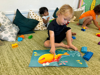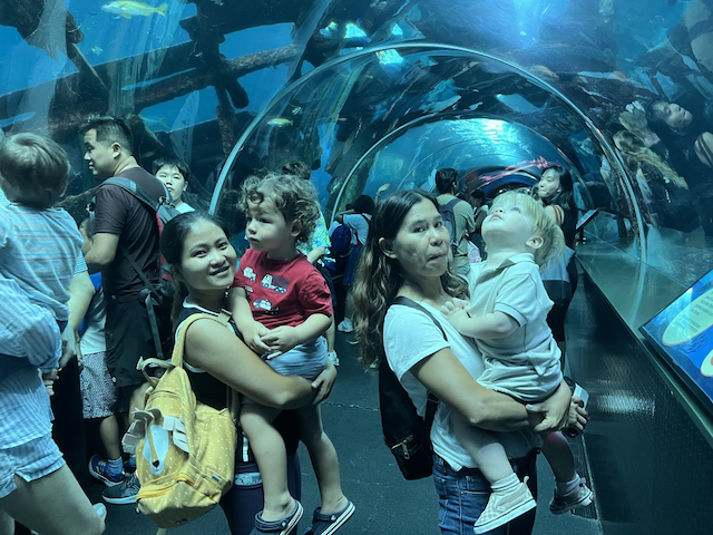 Kingston enjoying reading a book and spotting all the sea animals. Fish!'